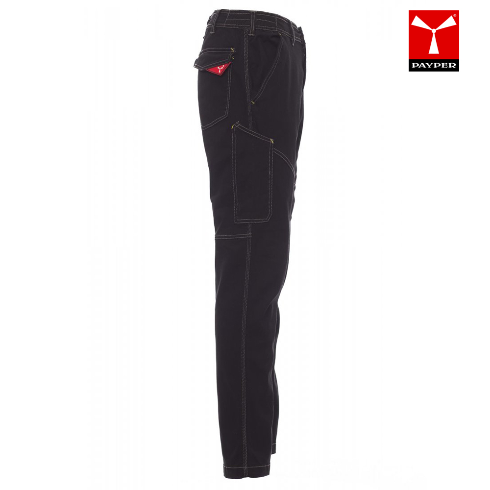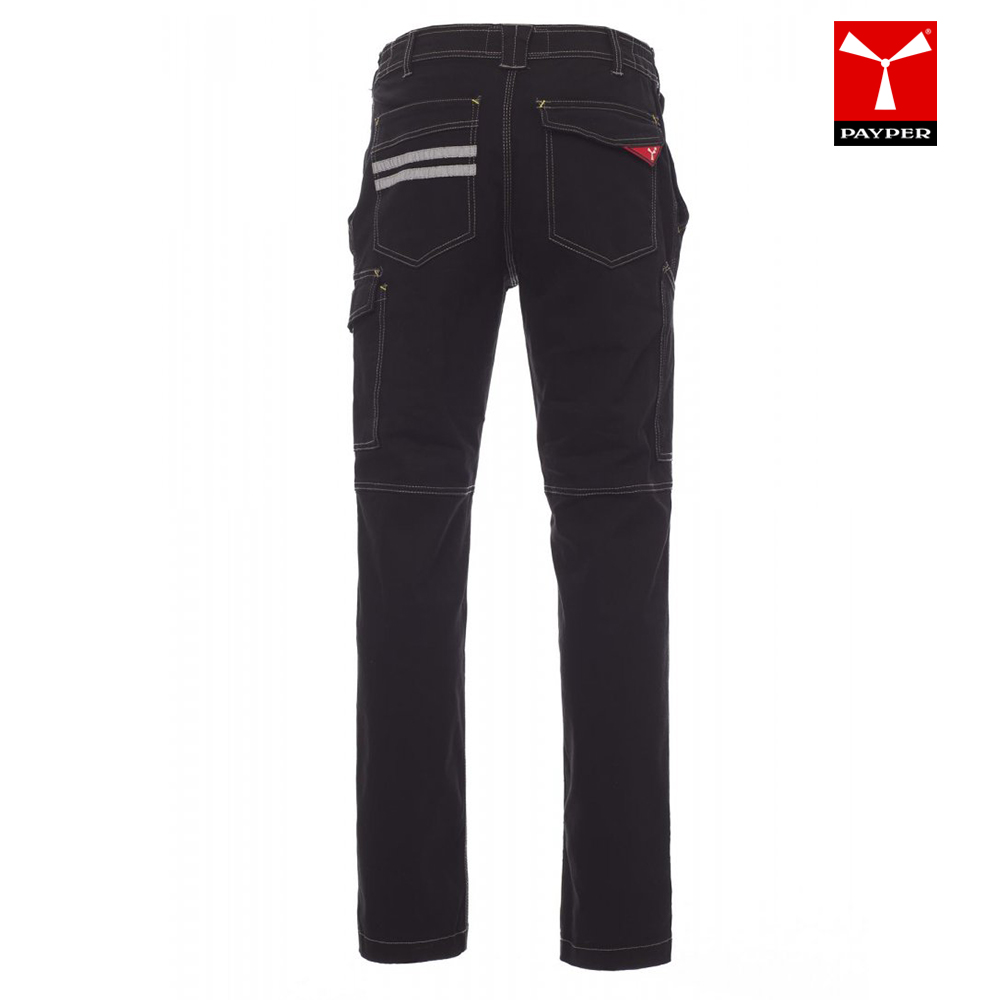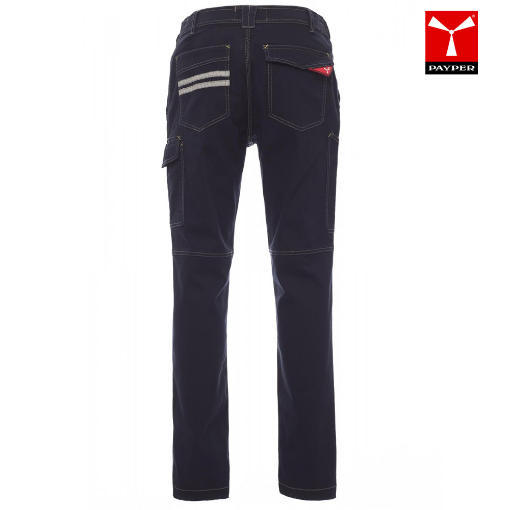 Model je zasnovan s stransko elastiko in pasnimi zankami za udobno prileganje ter varno uporabo z delovnim pasom. Opremljene so z dvema klasičnima sprednjima žepoma, stranskim žepom LOCK SYSTEM, žepom za ravnilo ter dvema zadnjima žepoma – enim odprtim in enim z zavihkom ter velcro zapiranjem za dodatno varnost shranjevanja manjših predmetov.